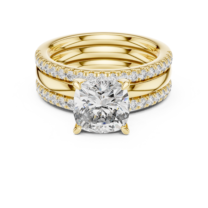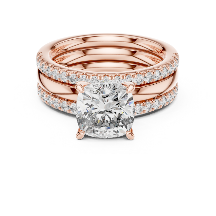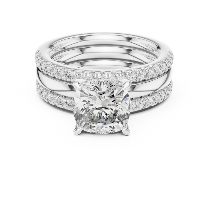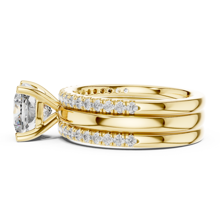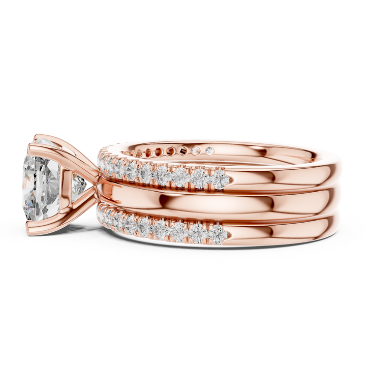 Say “forever” in style with this cushion cut lab-grown diamond bridal set, featuring a sparkling solitaire engagement ring paired with an elegant double pavé diamond band, meticulously crafted in 9kt, 14kt, or 18kt gold with choices of rose, yellow, or white gold. Set with an eco-friendly, conflict-free diamond, this sustainable engagement ring set captures the essence of ethical fine jewellery and the modern trend of sustainable luxury jewellery. Perfect for brides seeking a wedding ring set that combines a unique engagement ring design with timeless brilliance, this lab-grown diamond bridal set is the ultimate symbol of love, crafted responsibly for a lifetime of elegance.