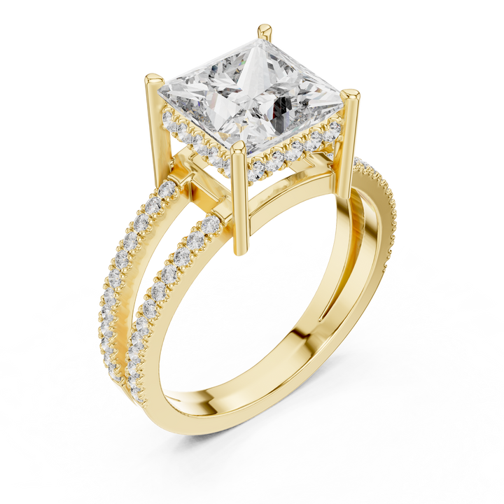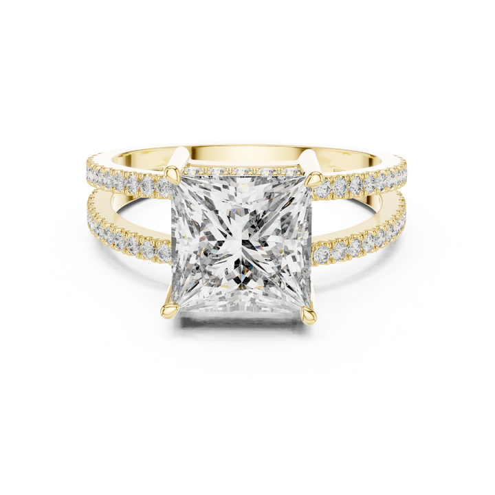 Turn heads with this princess cut lab-grown diamond engagement ring, featuring a dazzling solitaire elevated in a sleek four-prong setting and paired with a shimmering split pavé diamond band. Expertly handcrafted in 9kt, 14kt, or 18kt gold with options in rose, yellow, or white gold, this ring is set with an eco-friendly, conflict-free diamond, making it a true symbol of sustainable engagement rings and ethical fine jewellery. With its bold sparkle, modern solitaire design, and trending split shank style, this lab-grown diamond ring is the perfect choice for couples seeking a unique engagement ring design that blends timeless elegance with sustainable luxury jewellery.