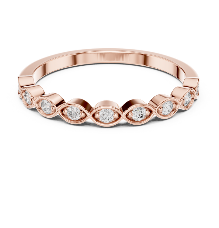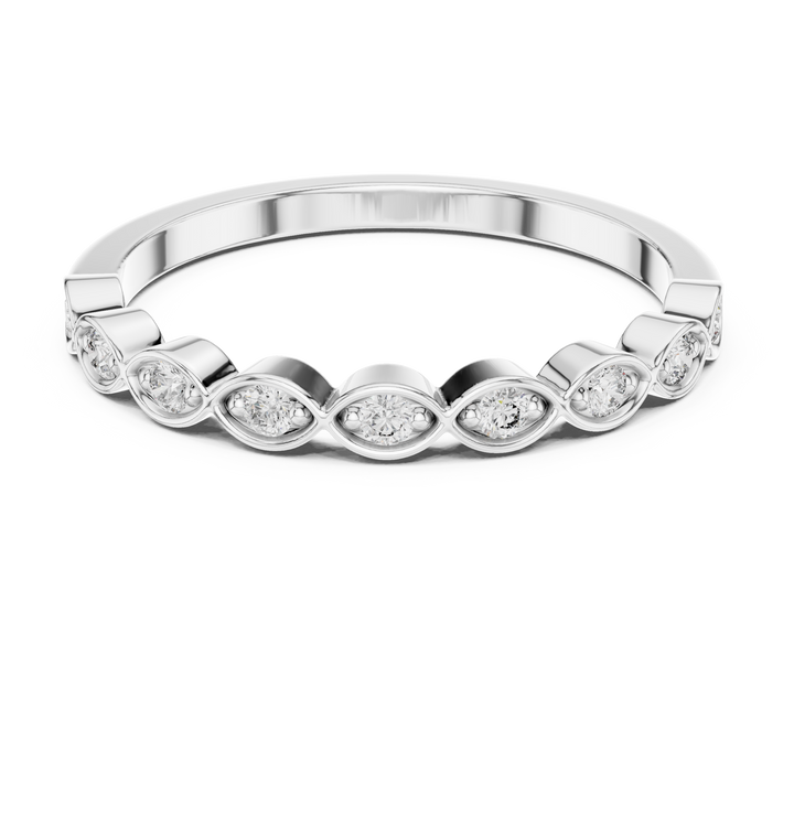 Discover refined elegance with our lab grown diamond bezel band ring, beautifully crafted in 9kt, 14kt, and 18kt gold. Featuring round-cut diamonds set in marquise-shaped bezels, this design combines modern minimalism with timeless charm, making it ideal as a stacking ring, wedding band, or everyday fine jewelry piece. Ethically created and eco-friendly, our sustainable lab grown diamond jewellery offers brilliance with a conscious choice. Perfect for women who love dainty yet stylish designs, this ring pairs effortlessly with solitaires or can be worn solo for understated sophistication.