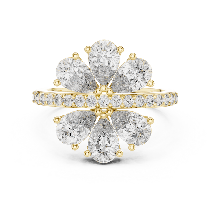 Celebrate elegance with this floral-inspired lab grown diamond ring, meticulously crafted in 9kt, 14kt, and 18kt gold. Featuring dazzling pear-shaped diamonds arranged in a blooming flower design with a shimmering pavé diamond band, this ring blends modern craftsmanship with timeless beauty. Ethically created and sustainably sourced, our lab grown diamond jewellery is the perfect choice for those who seek eco-friendly luxury, conflict-free sparkle, and trending engagement ring designs in 2025. Ideal as a statement ring, promise ring, or bridal jewellery, this masterpiece adds radiant charm to every occasion.