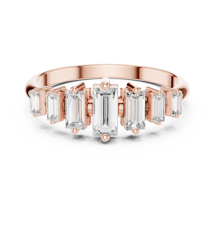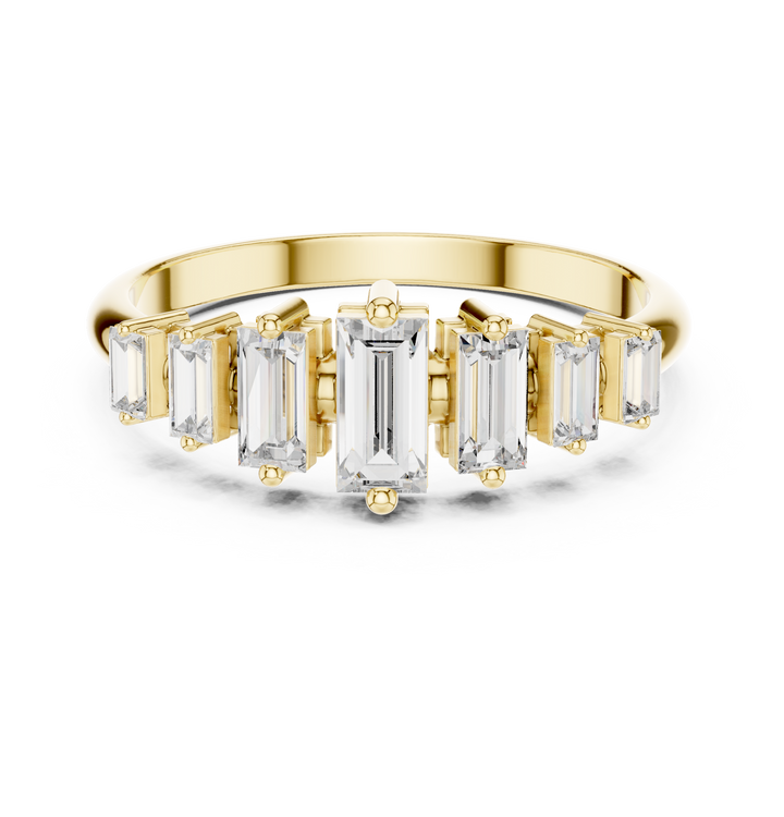 Redefine luxury with our lab grown diamond baguette band ring, crafted in 9kt, 14kt, and 18kt gold for a bold yet elegant look. Featuring a row of sleek emerald-cut diamonds set in a modern geometric design, this ring is perfect as a diamond wedding band, stacking ring, or statement jewellery piece. Ethically sourced and eco-friendly, our sustainable lab created diamond jewellery delivers maximum brilliance with a contemporary edge. Ideal for women who love unique, fashion-forward fine jewelry, this band pairs seamlessly with solitaires or shines beautifully on its own.